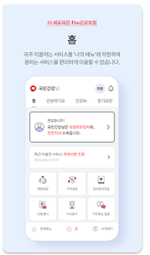 The건강보험 서비스는 공단 홈페이지내의 주요 콘텐츠를 국민들이 모바일에서 쉽고 빠르게 많은 정보를 접할 수 있도록 구성하였습니다.
