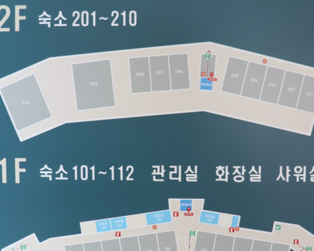 - 비치 물품 TV, 에어컨, 소형 냉장고, 침구류, 무료 공용 와이파이, 드라이기, 타월, 샴푸, 린스, 바디워시, 거울, 빗, 시설이용안내 책자